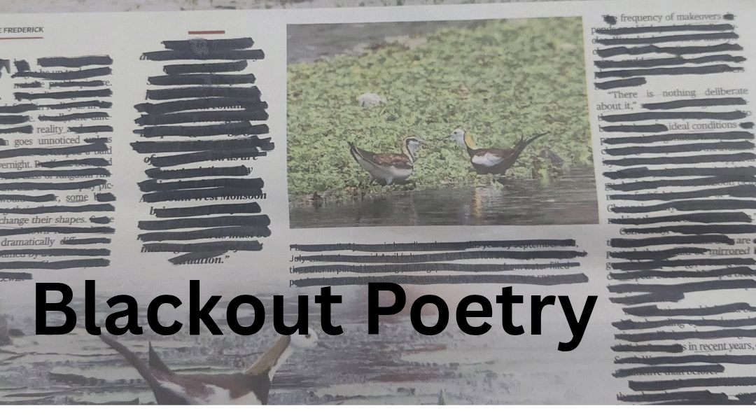Blackout poetry is a form of found poetry created by erasing or blacking out words from an existing text in a magazine or newspaper. The words that are not blacked out result in an entirely new poem that is quite unique in its context.